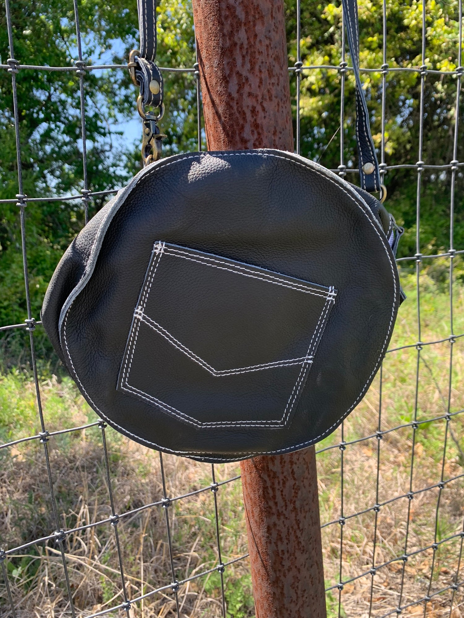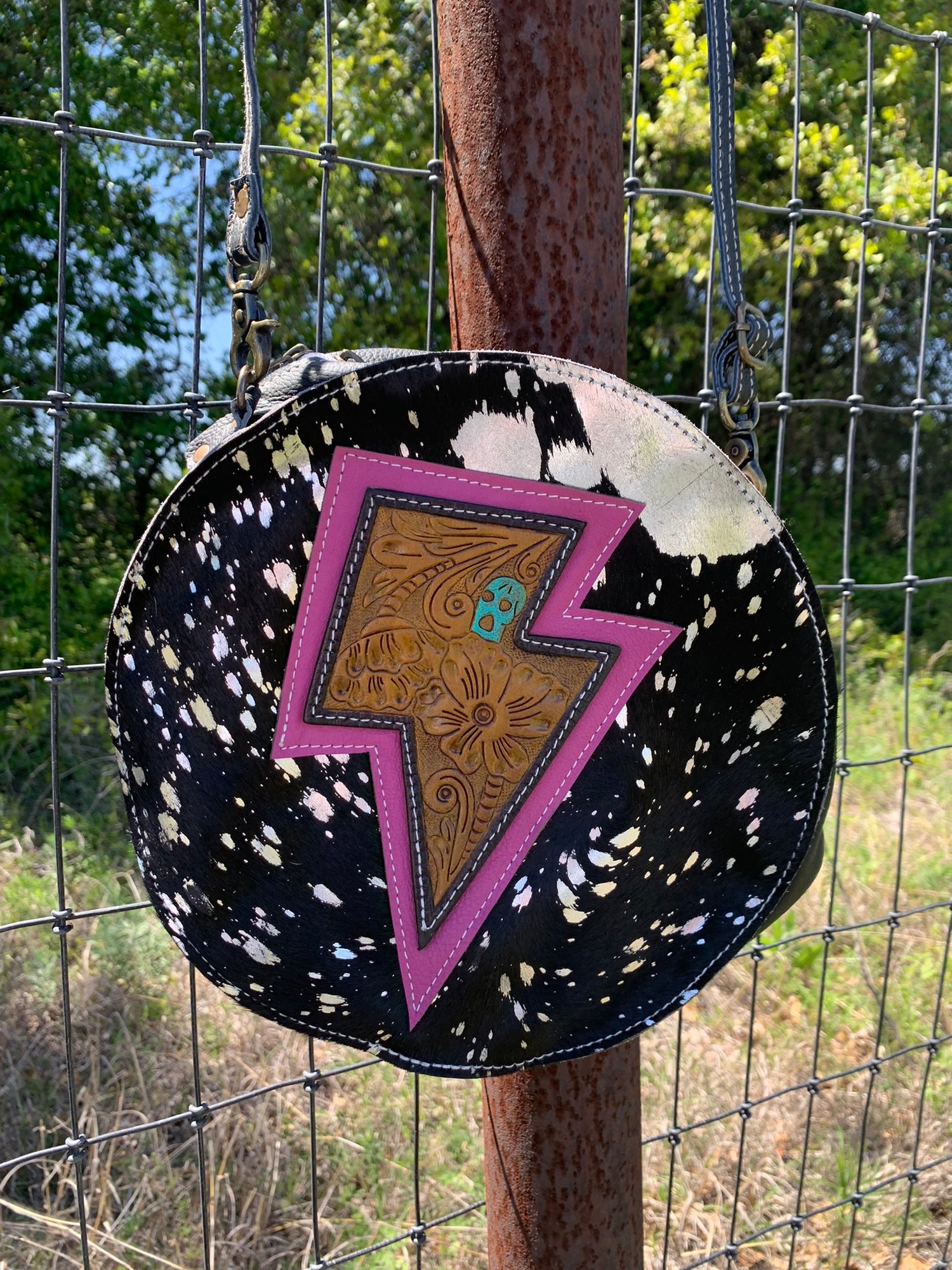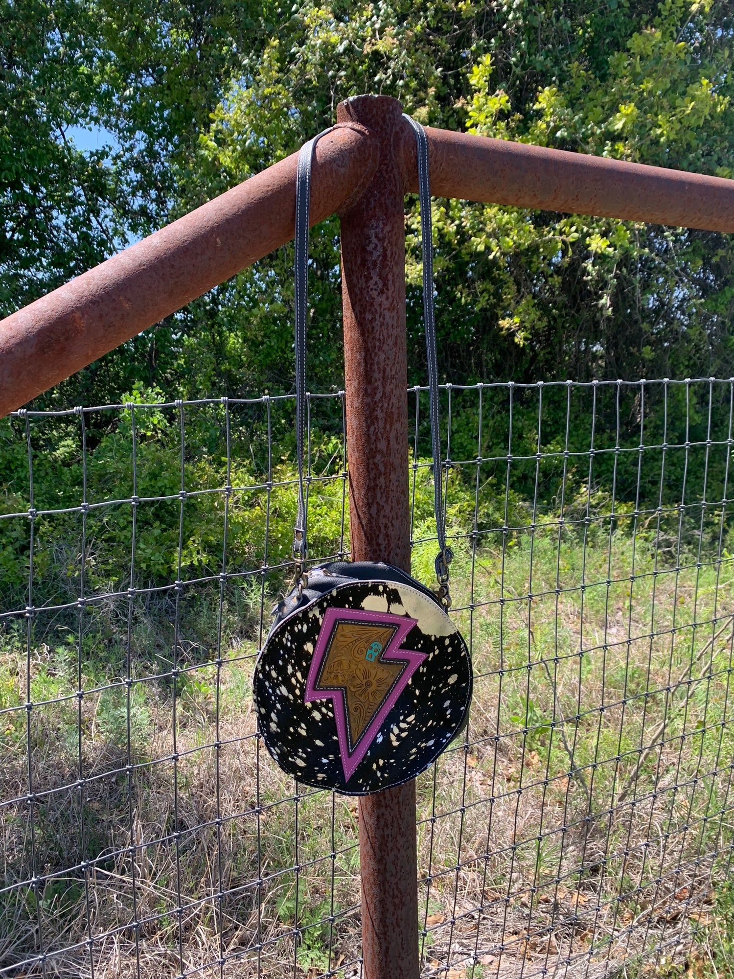 Genuine leather and hide! Super unique and spacious! Adjustable strap, outside pocket perfect sized for your phone!